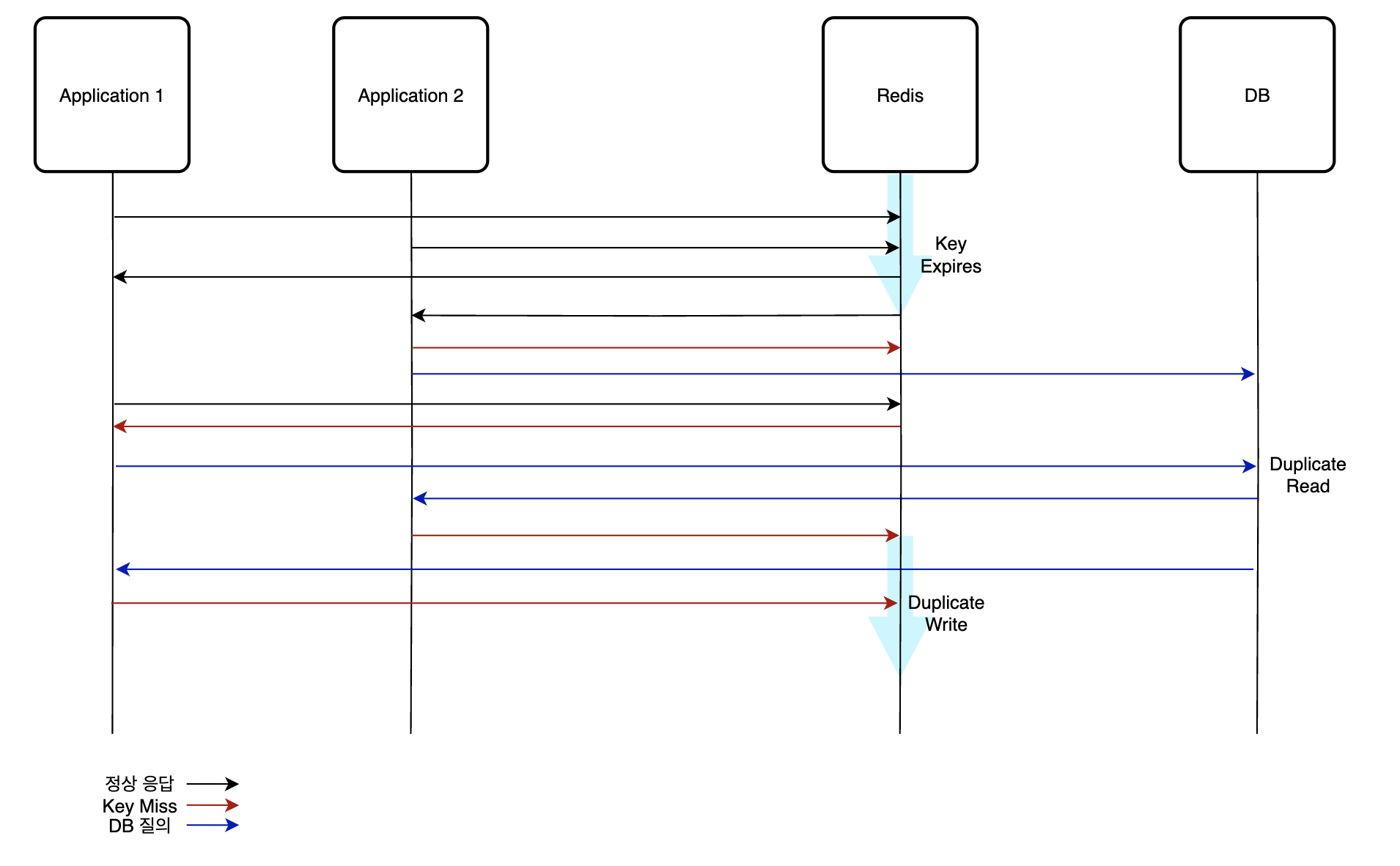 그런데 위 상황에서 key가 만료되는 순간 많은 서버에서 이 key를 같이 보고 있었다면 모든 어플리케이션 서버에서 DB로 가서 찾게 되는 duplicate read 가 발생한다.