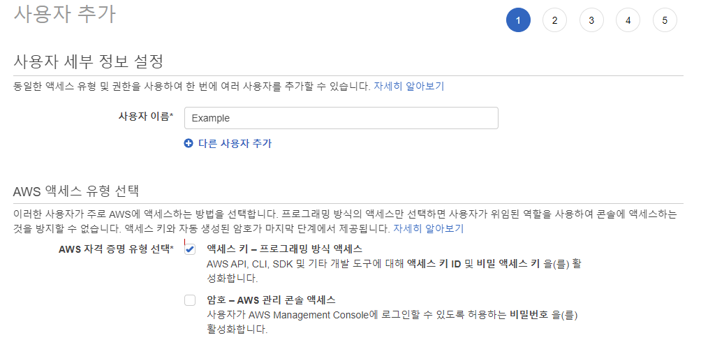 AWS 서비스의 IAM -> 사용자 -> 사용자 추가 -> AWS 엑세스 유형에 프로그래밍 방식 선택