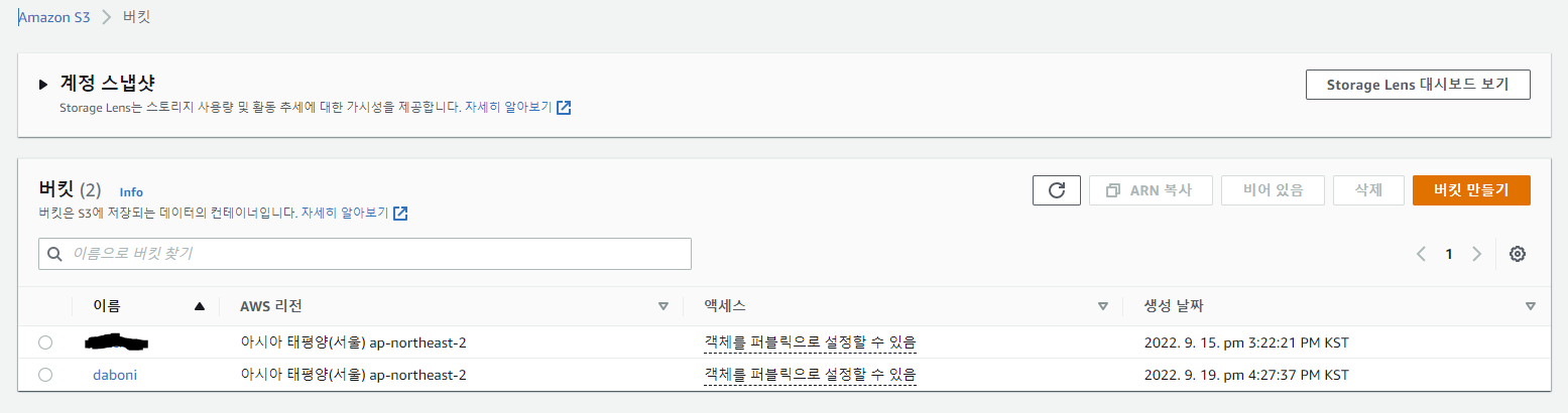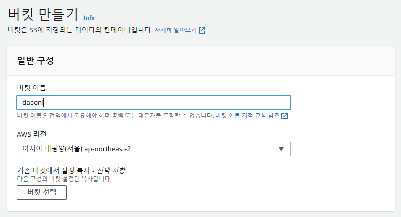 AWS 서비스의 S3 -> 버킷 -> 버킷 생성