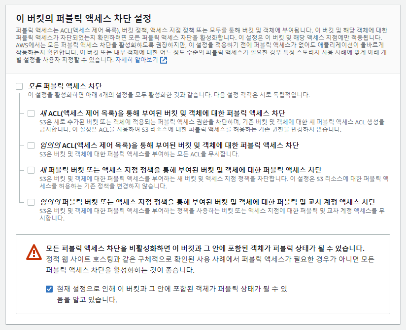 이 버킷의 퍼블릭 엑세스 차단 설정 체크 해제