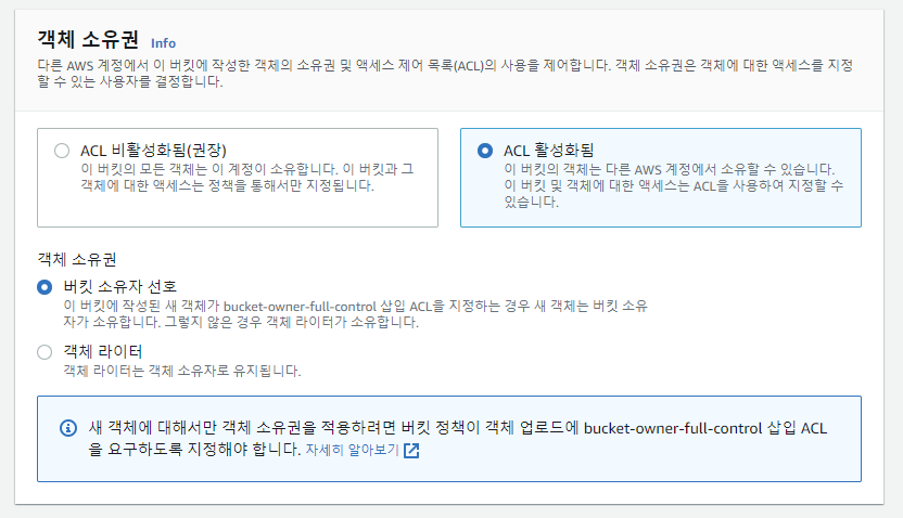 객체 소유권 ACL 활성화됨 선택 -> 버킷 소유자 선호 선택